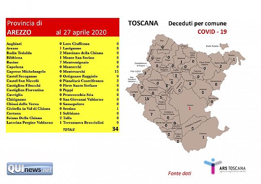 In aumento i guariti. Sono 13 le persone uscite definitivamente dalla malattia e più precisamente 2 nel capoluogo, 1 a Badia Tedalda, 1 a Bucine, 2 a Capolona, 2 a Castelfranco Piandisco, 1 a Castiglion Fiorentino, 1 a Laterina-Pergine, 1 a San Giovanni Valdarno, 1 a Sansepolcro, 1 a Subbiano.