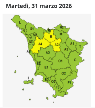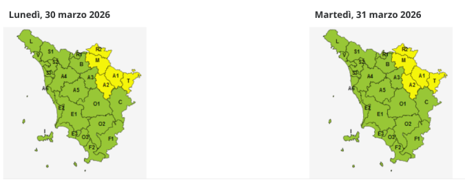 Ad essere interessate saranno in particolare la Toscana centrale con un codice giallo per rischio vento dalle 9 di domani, martedì 31 marzo, fino alle mezzanotte, e le zone del Mugello, Alto Mugello, Valtiberina e Casentino con un codice giallo per rischio neve dalle 22 di oggi fino alle 14 di martedì.